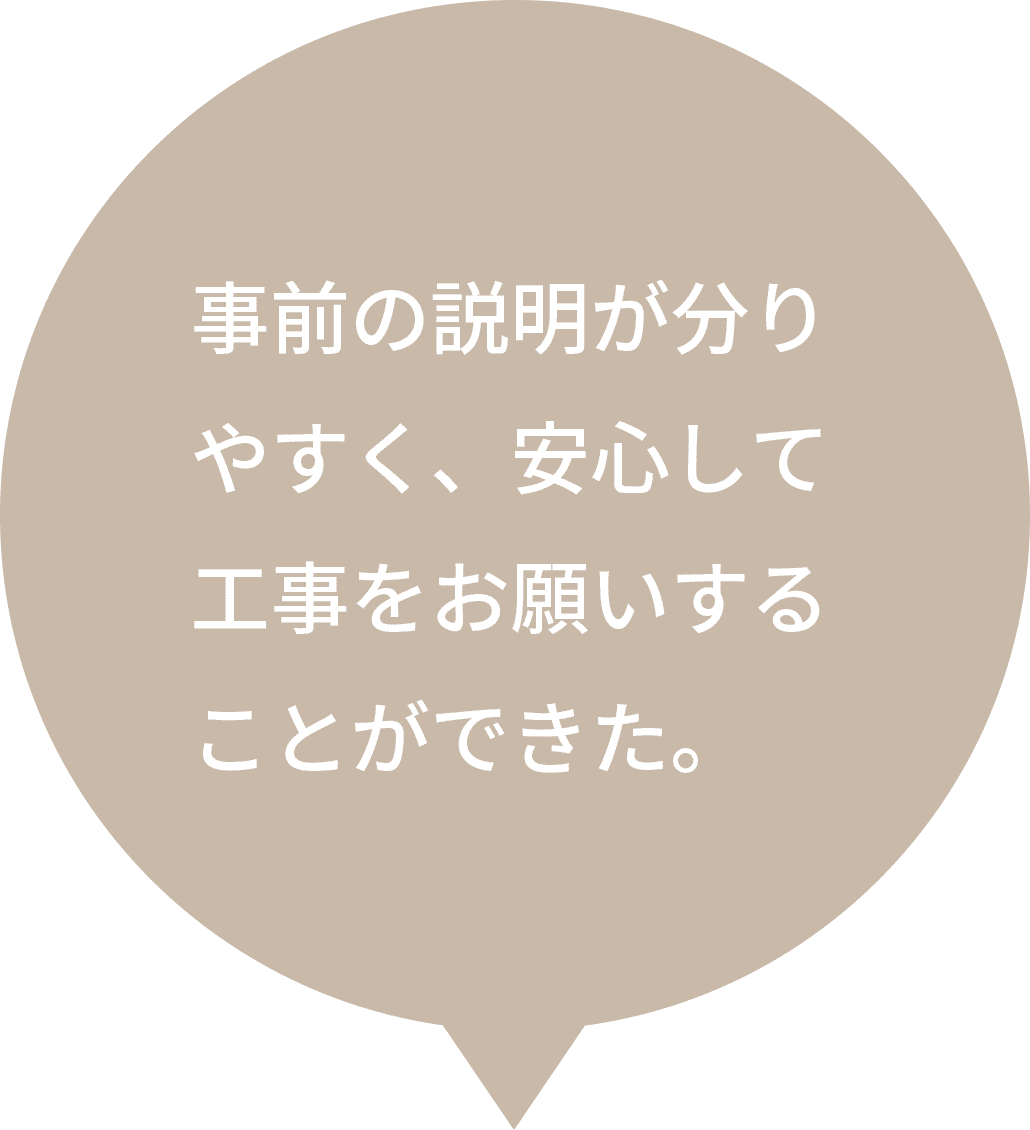 事前にお客様としっかりご相談させていただきましてお見積りを出させていただきます。必ず事前にお見積りを出しますので、それより高くなることはございません。万が一施工や見積りに変更点などが出てきた場合も、その都度お客様にご報告・ご説明させていただきますので、安心してお任せください。